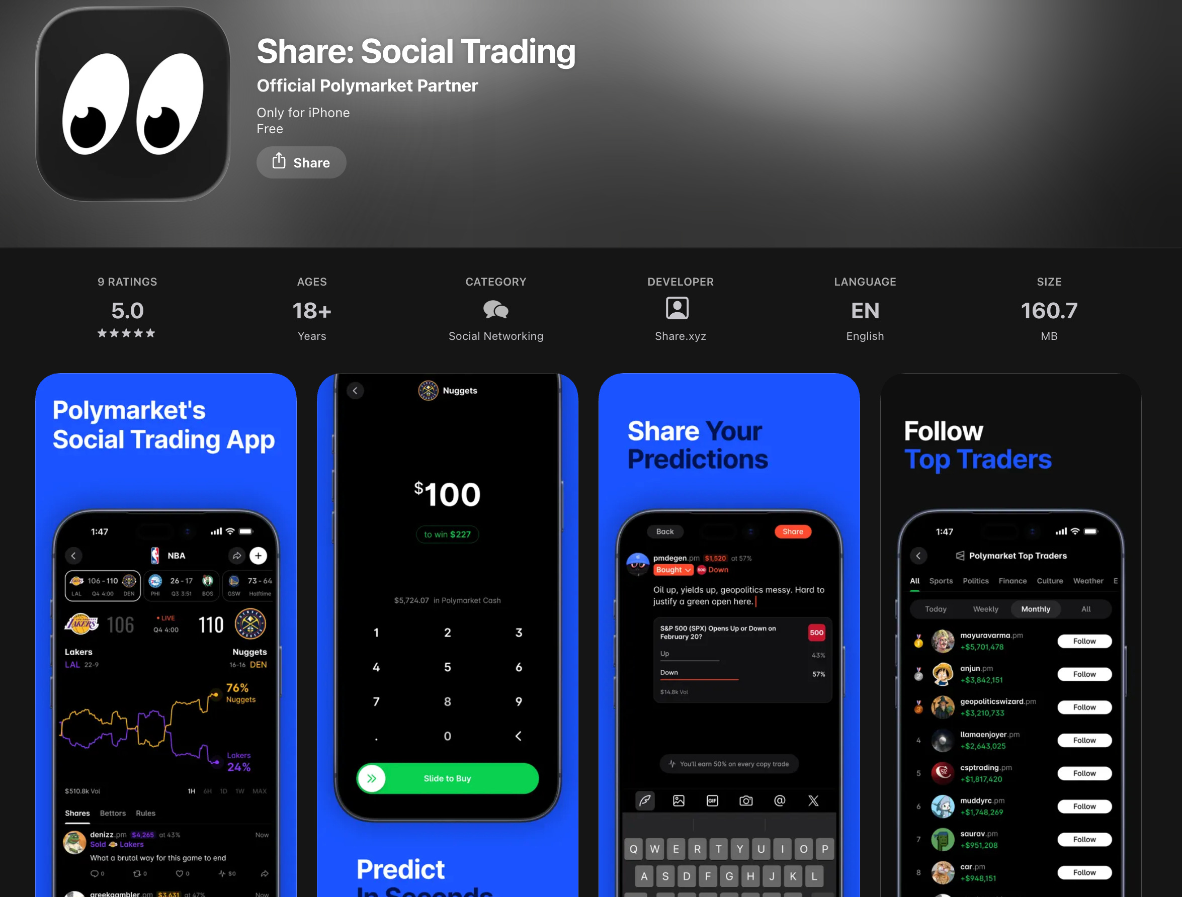 Share.xyzは、Polymarket公式パートナーとして認定されたソーシャルトレーディングアプリで、ユーザーは自分の予測市場取引をSNS感覚で投稿・共有でき、コピー取引ごとに収益の50%をリーダーが受け取れる仕組みが核心にある。