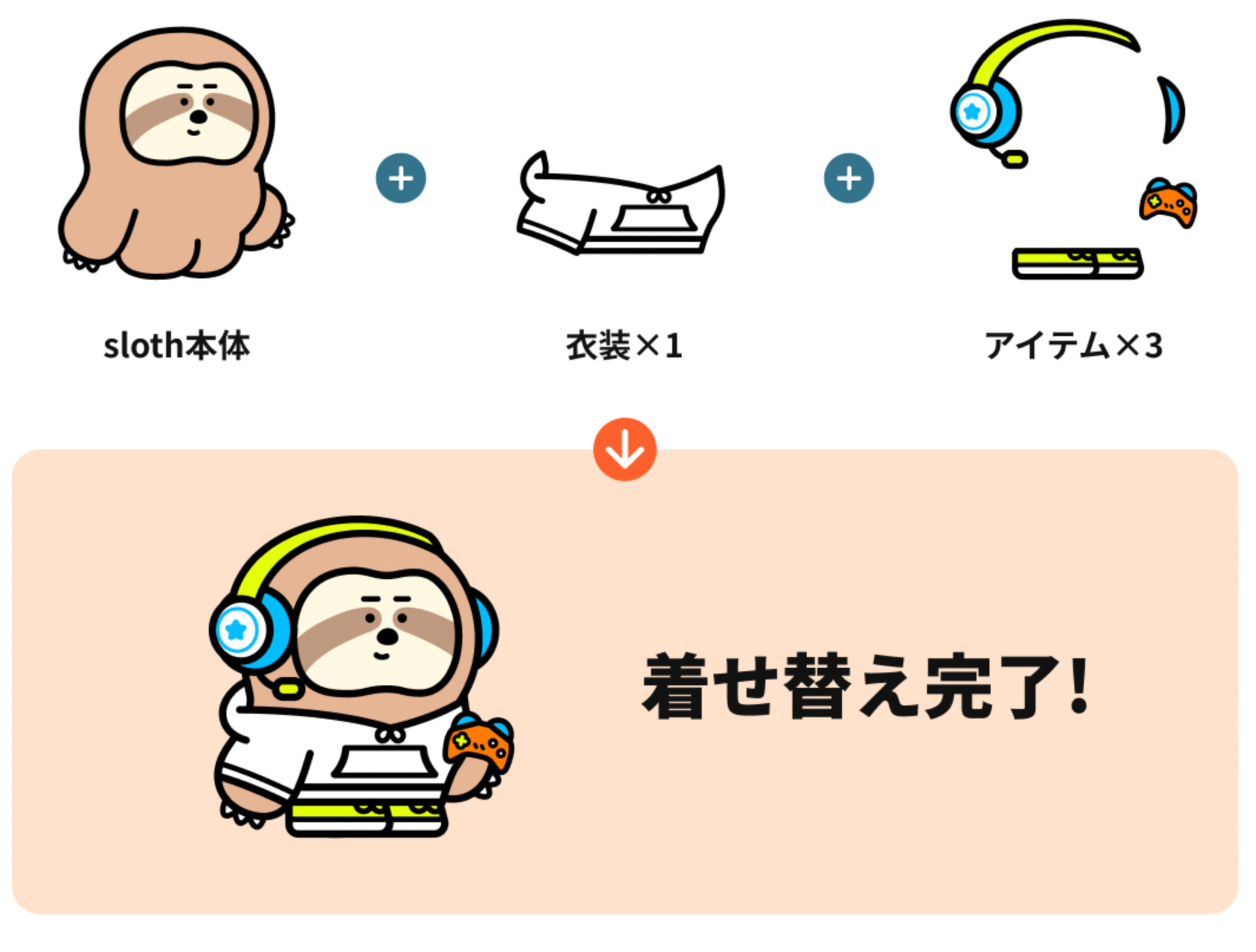 つまり、素体NFT、衣装NFT、アイテムNFT、スタンプNFTの4種類が存在し、それらを組み合わせることでオリジナルのslothを作ることができる着せ替えNFTです。