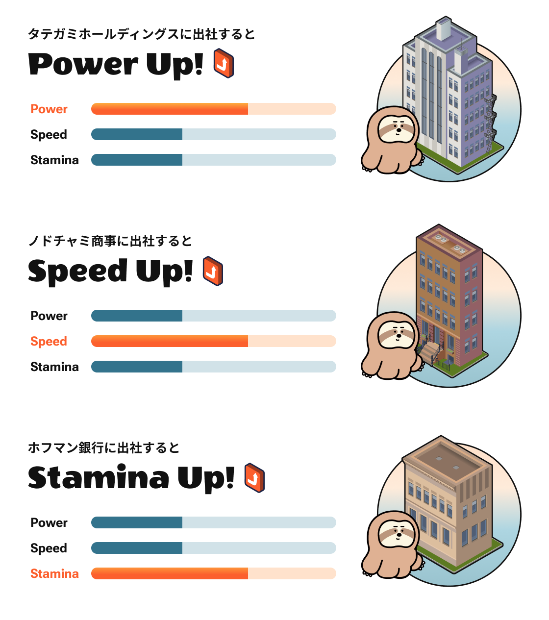 保有しているslothは3社の中から選択して出社させることが可能です。出社した会社によってslothのステータスが変化すると共に、報酬が貰えます。