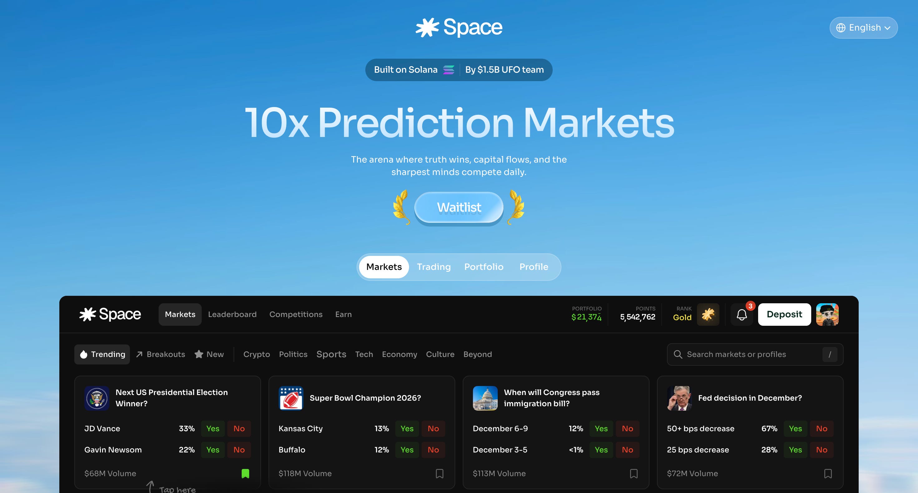 「Space」は、Solana上に構築された10倍レバレッジに対応した分散型予測市場プラットフォームです。