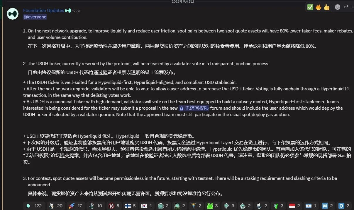 2025年9月5日、Hyperliquidは公式Discord内で独自ステーブルコインである「$USDH」構想の発表と、発行パートナーの公募を開始しました。