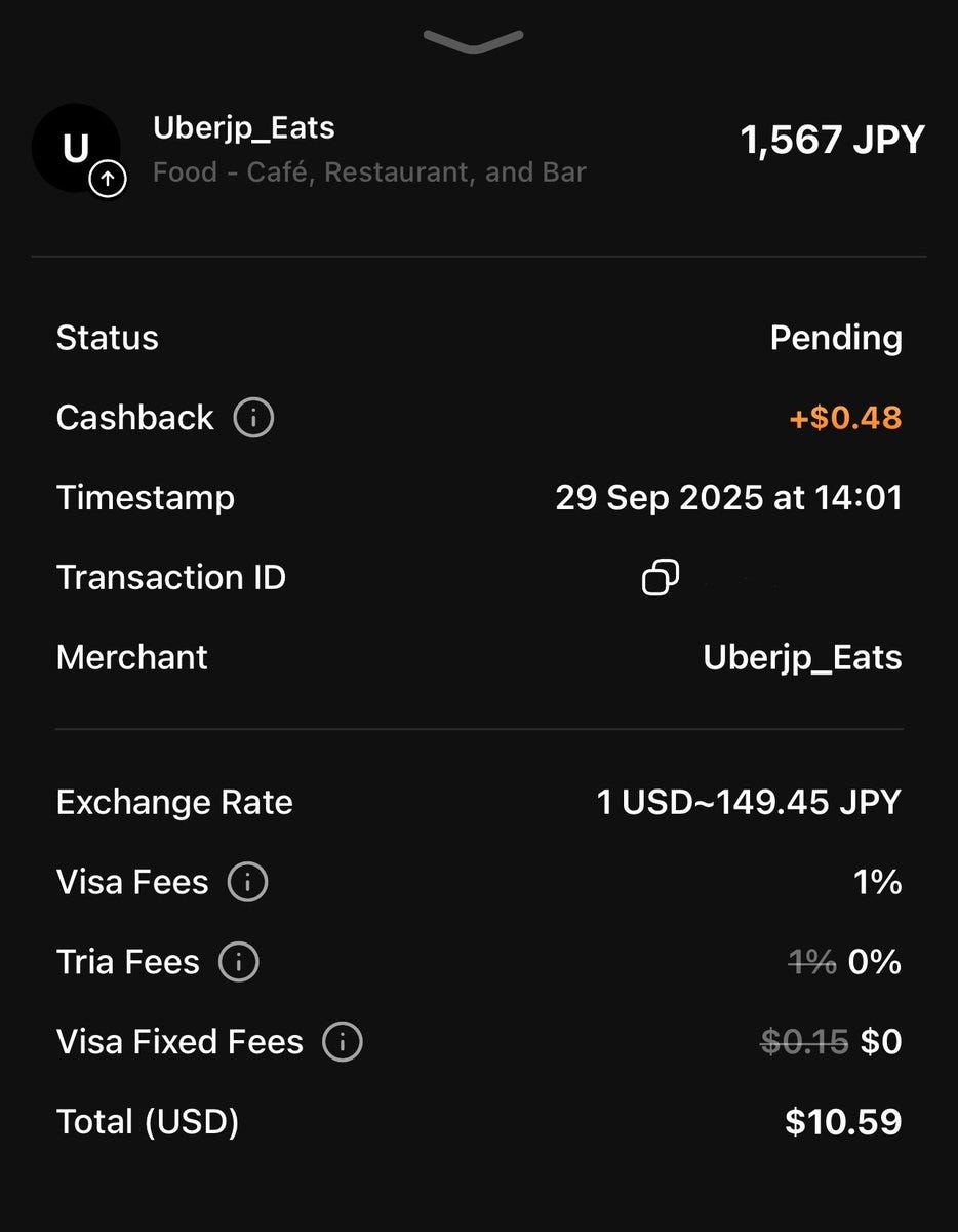 また、Triaカードは手数料が極めて安いことも特徴です。現在はVisa Feeの1%だけが手数料として発生し、それ以外はかかりません。