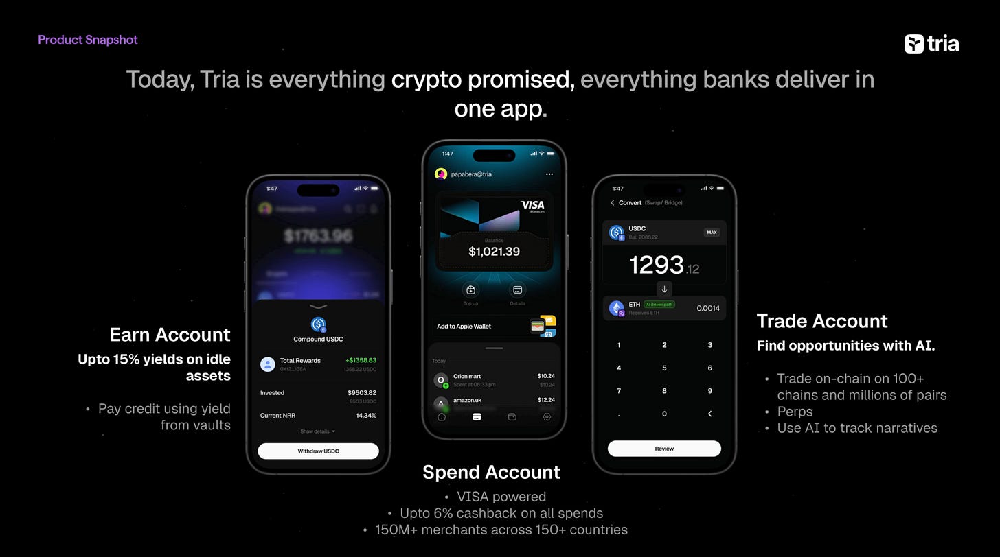Triaは、カード決済(最大6%キャッシュバック)、クロスチェーン最適化(BestPath AVS)、利回り運用(10〜15%のAPR)、取引(最大50倍のレバレッジ)を統合した、暗号資産ネイティブの次世代セルフカストディ型デジタルバンク。