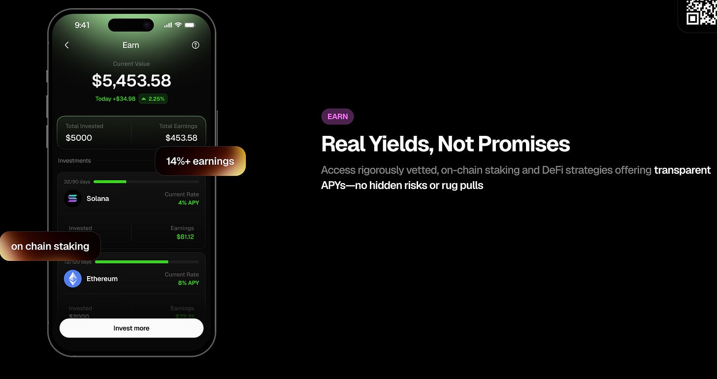 Triaは「Real Yields, Not Promises(約束でなく実利の利回り)」と称し、高利回りのステーブルコイン運用やステーキング機能を提供します。