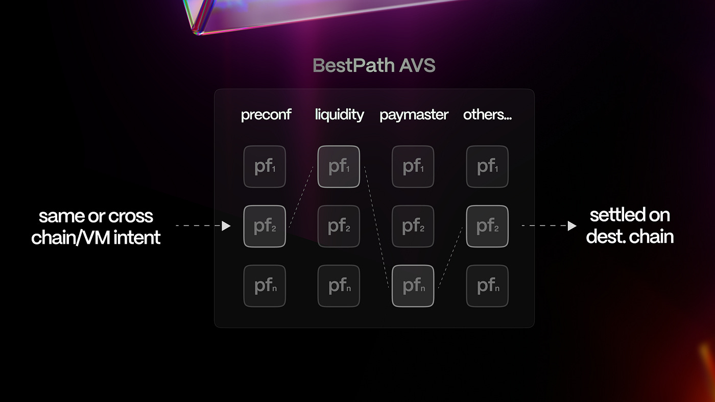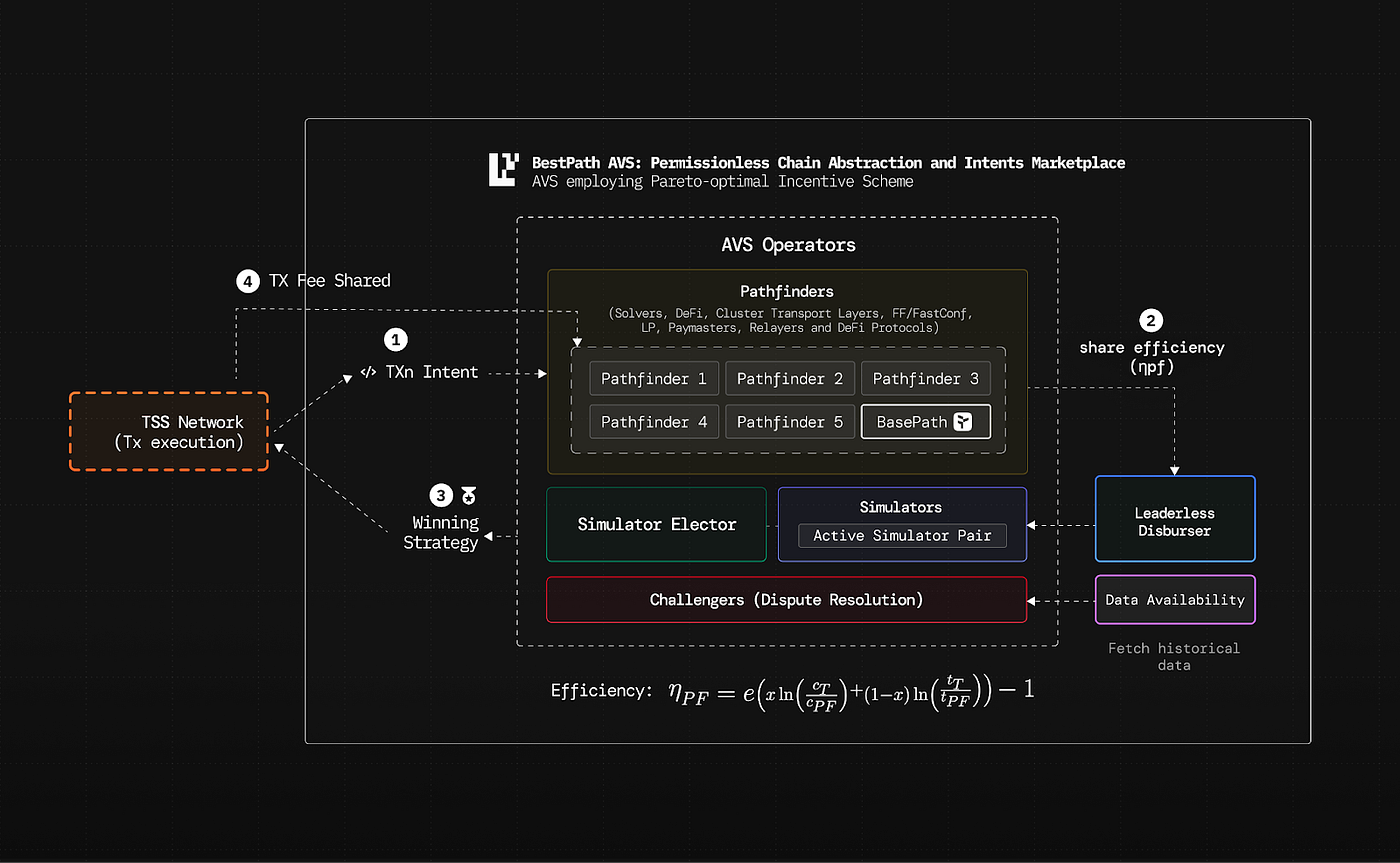 BestPath AVSが頭を使う:Pathfinderたちがインテントを実現する経路を提案し、Simulatorが検証 → 勝ち残った「最適ルート」が選ばれる。