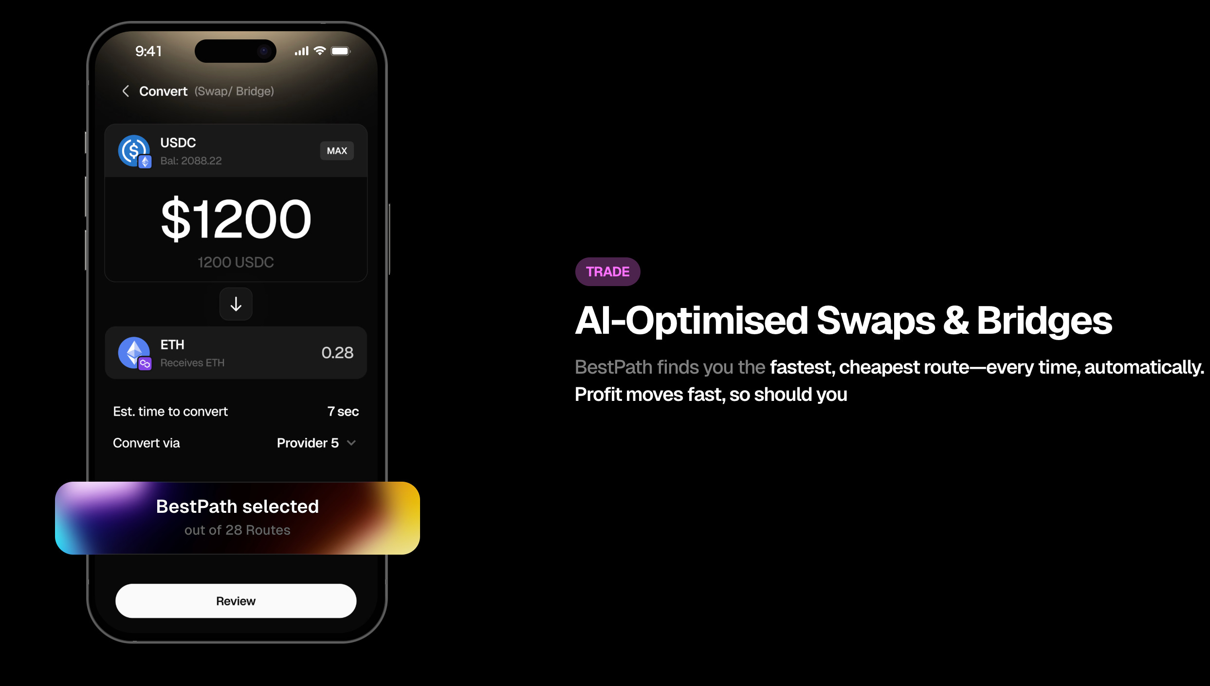 Triaは独自のクロスチェーントランザクション最適化エンジン「BestPath AVS」を搭載しています。さらに、Triaは独自のクロスチェーン基盤「Unchained」上に構築されていることで、ガス代不要・シードフレーズ不要のスムーズなユーザー体験を実現しています。(※BestPath AVS、Unchained等の技術基盤の説明は後ほど)