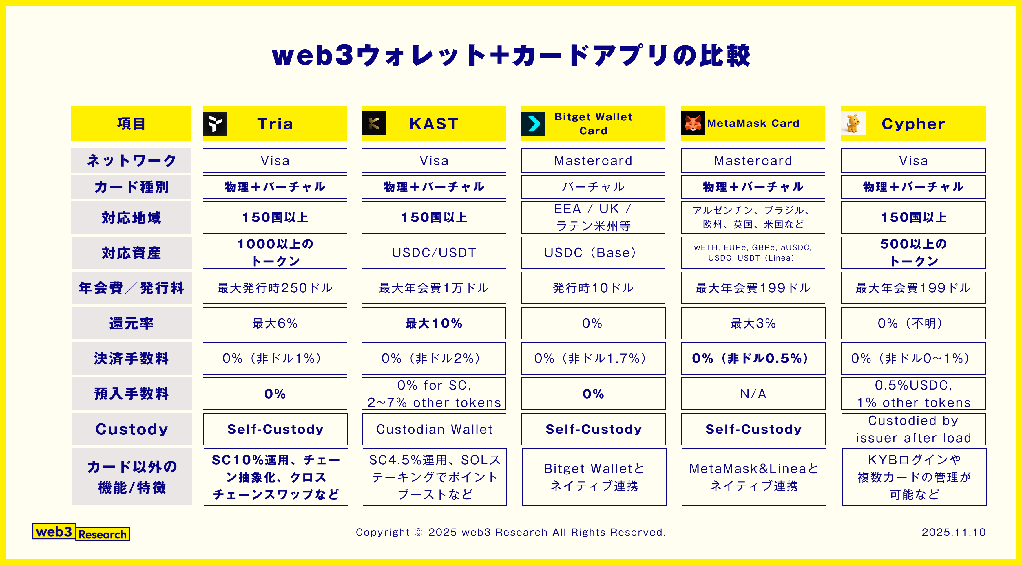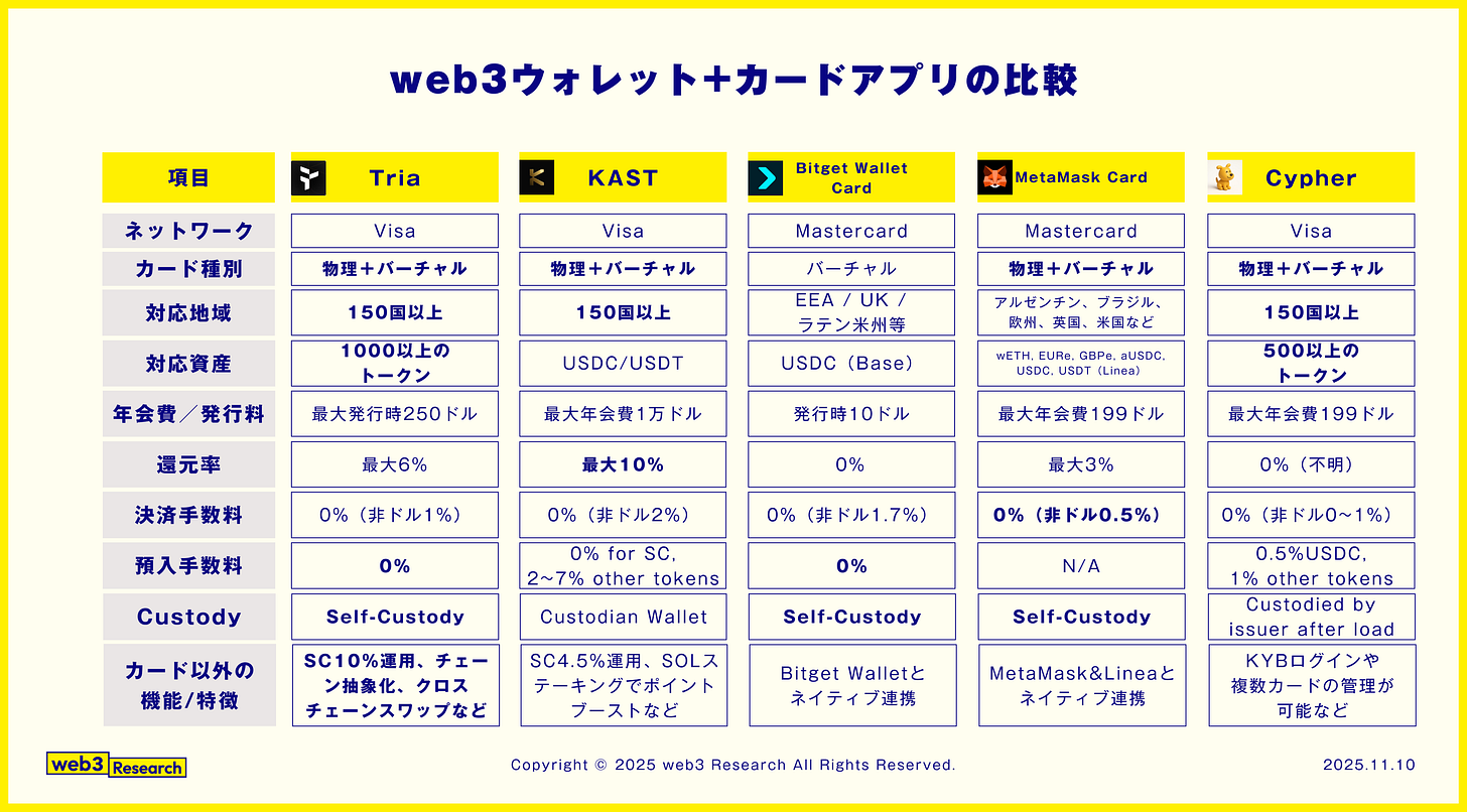 これらも踏まえて、すでにリリースされている主要なウォレット+カードプロジェクトとTriaを比較してみます。