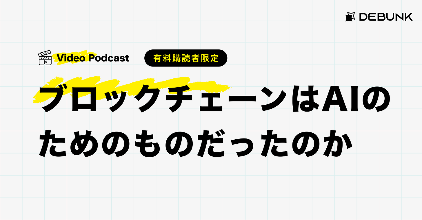Playback speed×Share postShare post at current timeShare from 0:000:00/0:00Paid episodeThe full episode is only available to paid subscribers of DEBUNK(web3 Research)Subscribe to watchブロックチェーンはAIのためのものだったのか動画解説|1週間の更新した記事の振り返りmitsuiFeb 27, 2026∙ PaidShareおはようございます。web3リサーチャーのmitsuiです。今日は「1週間の更新した記事の振り返りとポッドキャスト」です。毎週土曜日には有料購読者限定でビデオポッドキャスト形式での振り返りを実施しています。ぜひご覧ください!SubscribeContinue reading this post for free, courtesy of mitsui.Claim my free postOr purchase a paid subscription.DEBUNK(web3 Research)SubscribeAuthorsmitsuiRecent Postsクリプトはこの先どこに行くのかFeb 25 • mitsuiWeb4の時代へ突入Feb 20 • mitsuiニュースレターの名称を「DEBUNK」に変更しましたFeb 13 • mitsuiアテンションエコノミーの次はドーパミンエコノミーFeb 6 • mitsuiEthereumにL2はもう要らない?Feb 5 • mitsuiAI×クリプトの交差点が面白いJan 30 • mitsui実業と組み合わせたトークンエコノミクスを考えてみるJan 29 • mitsui