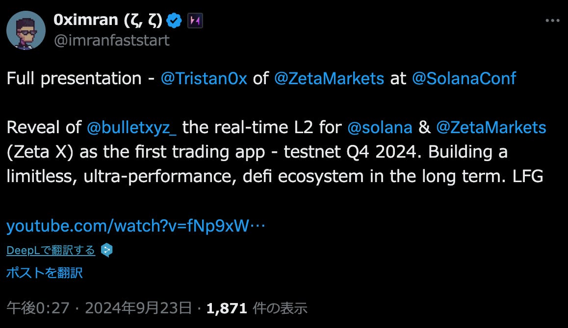 Zeta Markets は、2024 年第 4 四半期に Bullet のテストネットを展開し、2025 年第 1 四半期にメインネットを立ち上げる予定