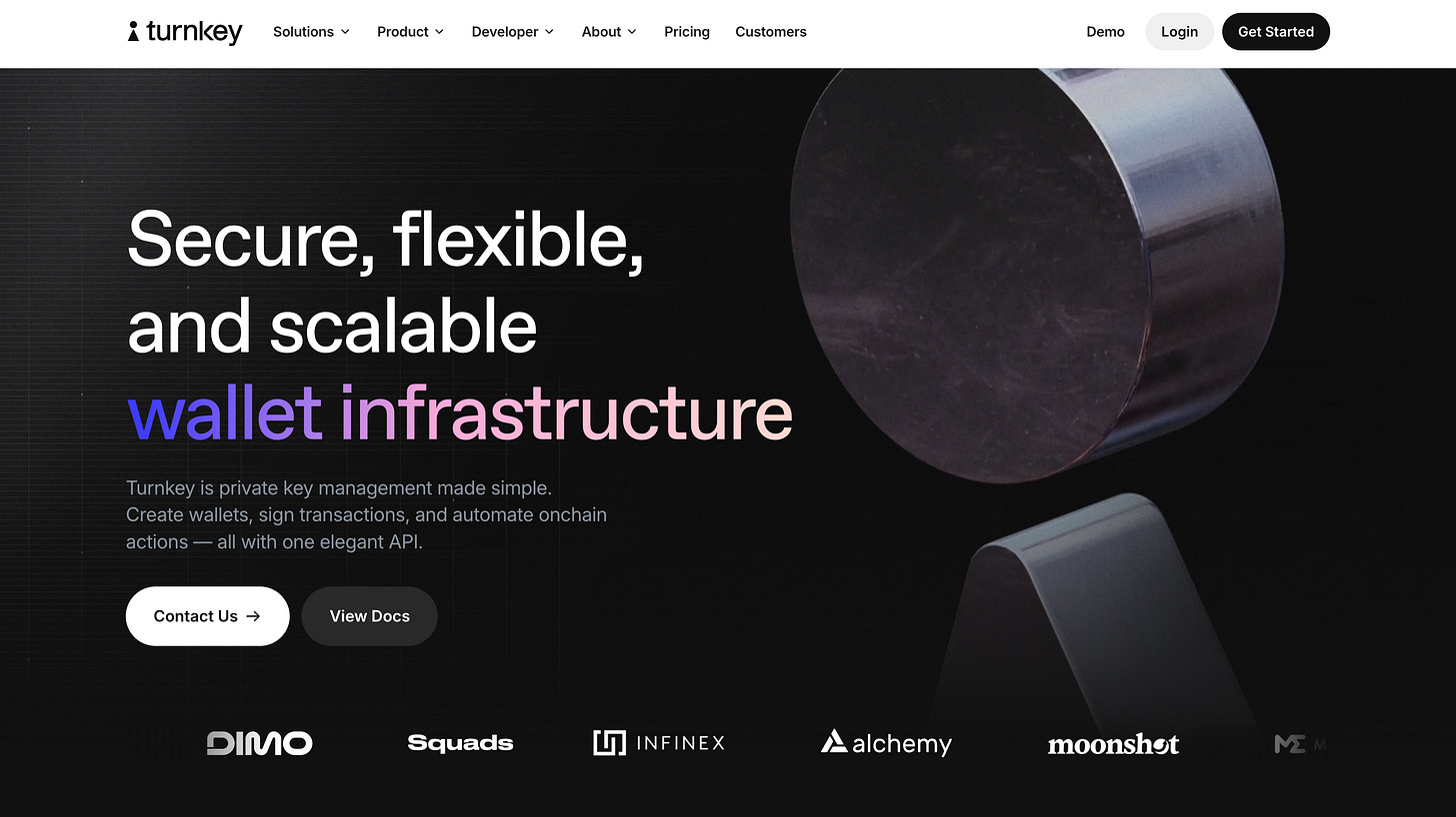 概要:秘密鍵を安全に管理するためのシンプルなAPIを提供するプラットフォーム。ユーザーは数百のウォレットを作成し、あらゆるチェーンにわたって数千のトランザクションに署名できる。これらはすべて、柔軟でプログラム可能な権限によって、必要な署名のみを確実に行うことができる。