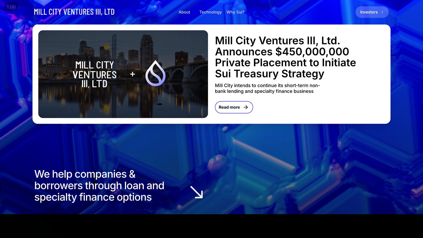 概要:上場専門金融会社であり、民間企業、上場マイクロキャップ、富裕層個人を対象に、短期の担保付き融資を提供。最近、同社は財団支援による初のSUIトレジャリー戦略を立ち上げ、機関投資家チャネルおよびSui Foundationとの直接契約を通じて7,600万SUIトークンを取得。これにより、Mill Cityは、Suiエコシステムへの日々の流動性と規制されたアクセスを提供する唯一の上場企業となり、従来の融資の専門知識と暗号資産トレジャリーへのエクスポージャーを融合させている。