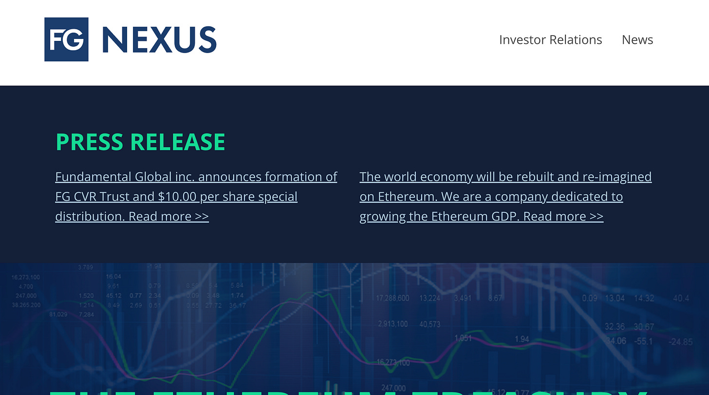 概要:米国上場の資本市場企業であり、蓄積、ステーキング利回り、ステーキングに裏付けられたトークン化に重点を置くイーサリアム財務会社。再保険、マーチャントバンキング、リスクアセット発行といった商品を活用し、FG Nexusは2億ドルを超える大規模な流動性を活用し、ステーキングとトークン裏付けのエクスポージャーを通じてETH準備金を増やしている。