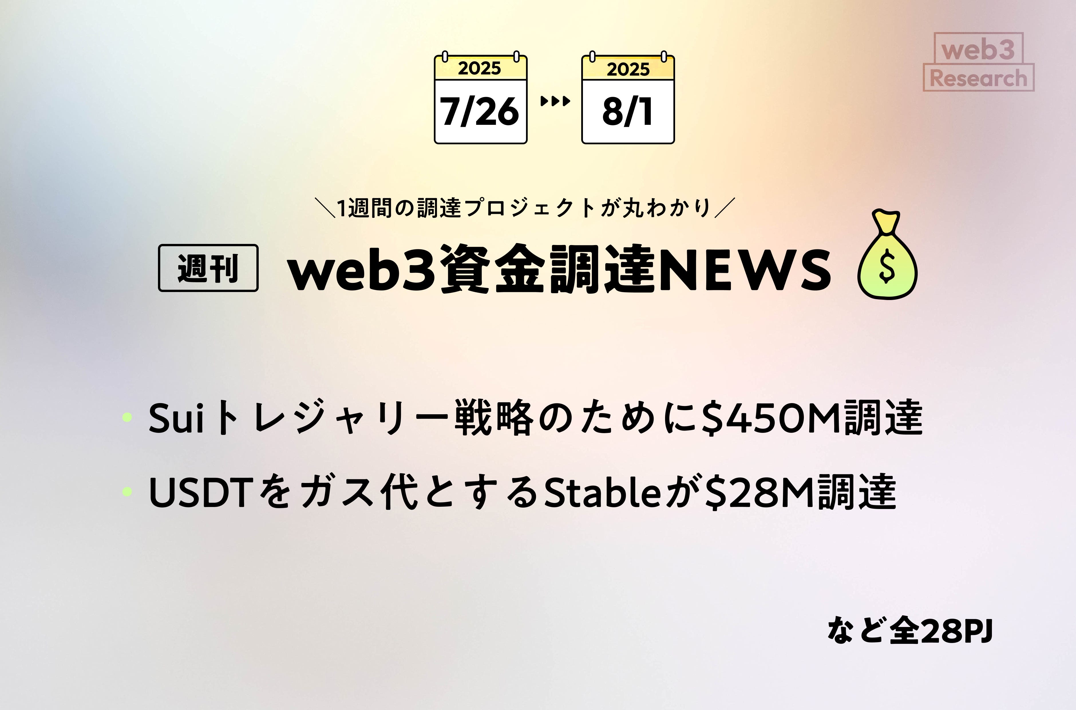 NewsSuiトレジャリー戦略のために$450M調達、USDTをガス代とするStableが$28M調達、など全28PJ【資金調達PJまとめ】7/26~8/1の資金調達PJ28選mitsuiAug 02, 2025∙ PaidShareおはようございます。web3リサーチャーのmitsuiです。今日は「今週1週間の資金調達PJのまとめ」です。SubscribeThis post is for paid subscribersSubscribeAlready a paid subscriber? Sign inPreviousNext