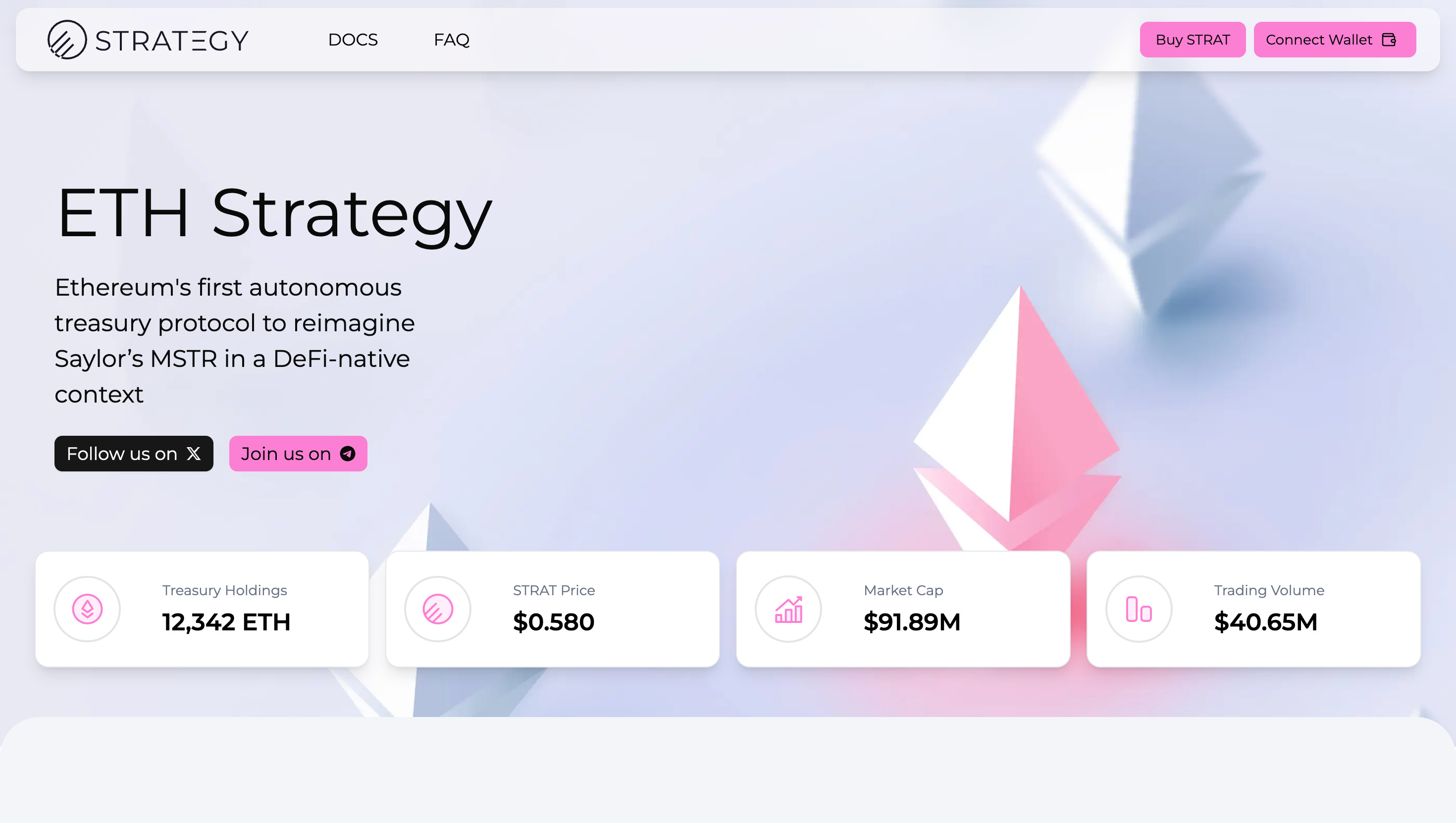 概要:証拠金清算やボラティリティの低下なしにレバレッジをかけたETHエクスポージャーを提供する、自律型オンチェーン・トレジャリー・プロトコル。転換社債とETHボンディングを通じてETHを蓄積し、STRATトークン1枚あたりのETHを増加させながら、希薄化を維持。MSTRスタイルのトレジャリーモデルに着想を得たETH Strategyは、ガンマボールトやリスク管理されたETHコール売りといったDeFiネイティブツールを搭載。