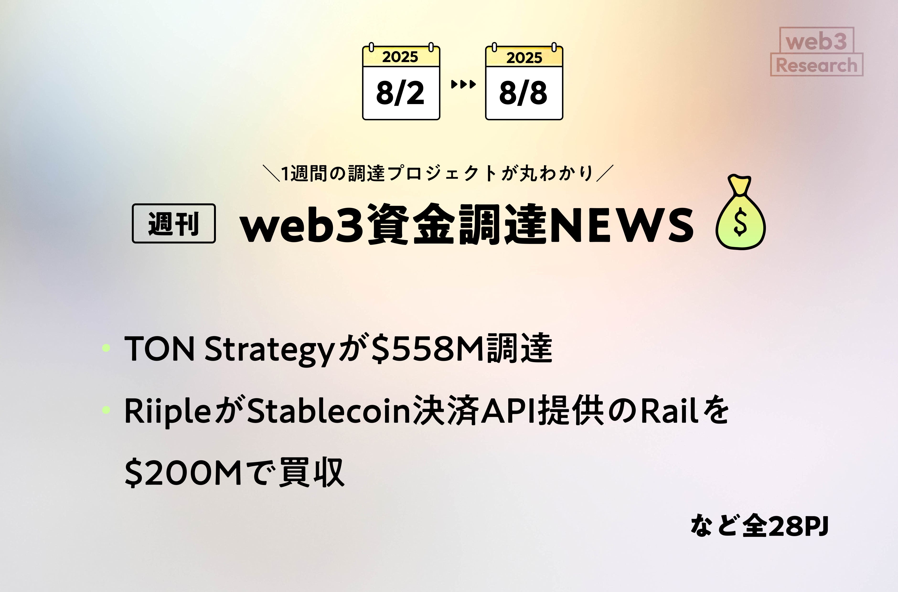 NewsTON Strategyが$558M調達、RiipleがStablecoin決済API提供のRailを$200Mで買収、など全24PJ【資金調達PJまとめ】8/2~8の資金調達PJ24選mitsuiAug 09, 2025∙ PaidShareおはようございます。web3リサーチャーのmitsuiです。今日は「今週1週間の資金調達PJのまとめ」です。SubscribeThis post is for paid subscribersSubscribeAlready a paid subscriber? Sign inPreviousNext