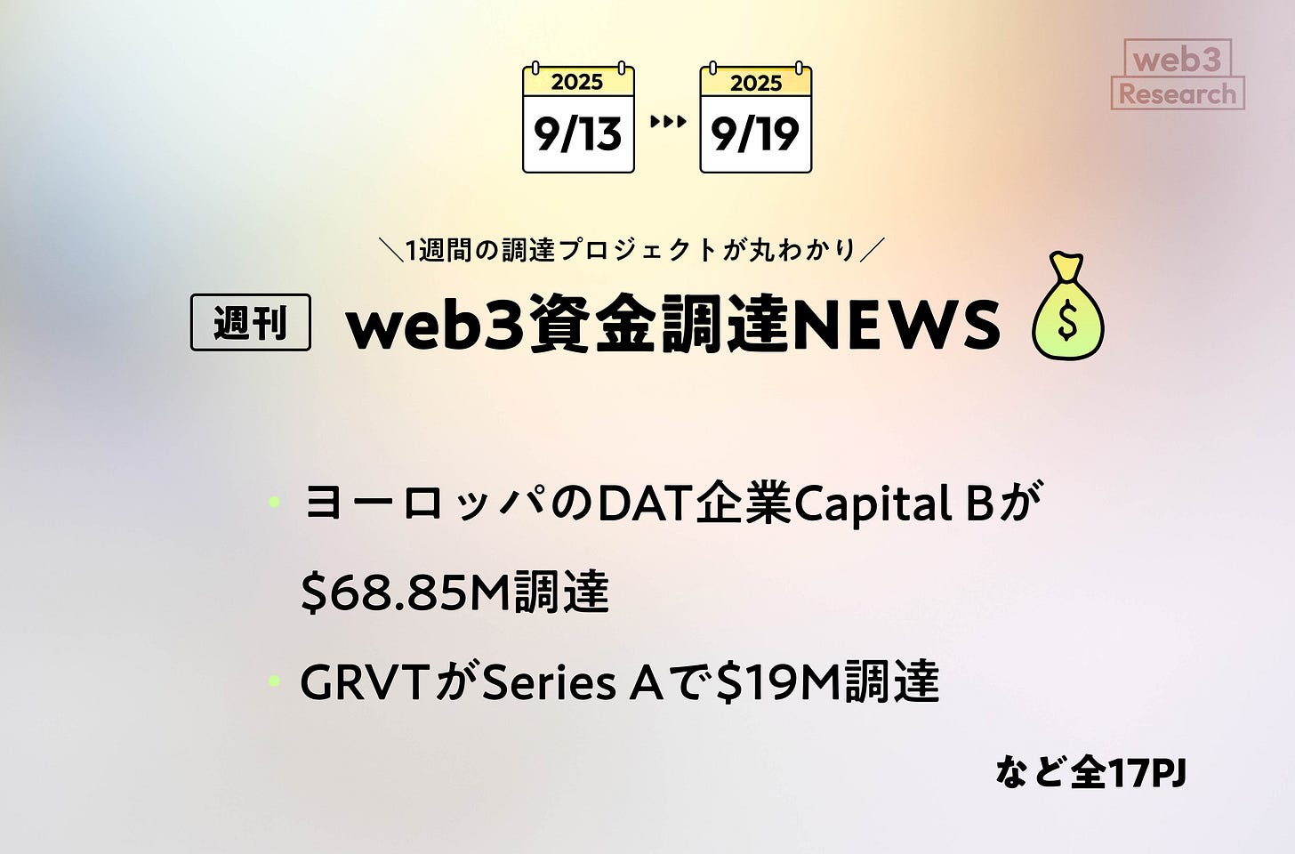 NewsヨーロッパのDAT企業Capital Bが$68.85M調達、GRVTがSeries Aで$19M調達、など全17PJ【資金調達PJまとめ】9/13~19の資金調達PJ17選mitsuiSep 20, 2025∙ Paid2Shareおはようございます。web3リサーチャーのmitsuiです。今日は「今週1週間の資金調達PJのまとめ」です。SubscribeThis post is for paid subscribersSubscribeAlready a paid subscriber? Sign inPreviousNext