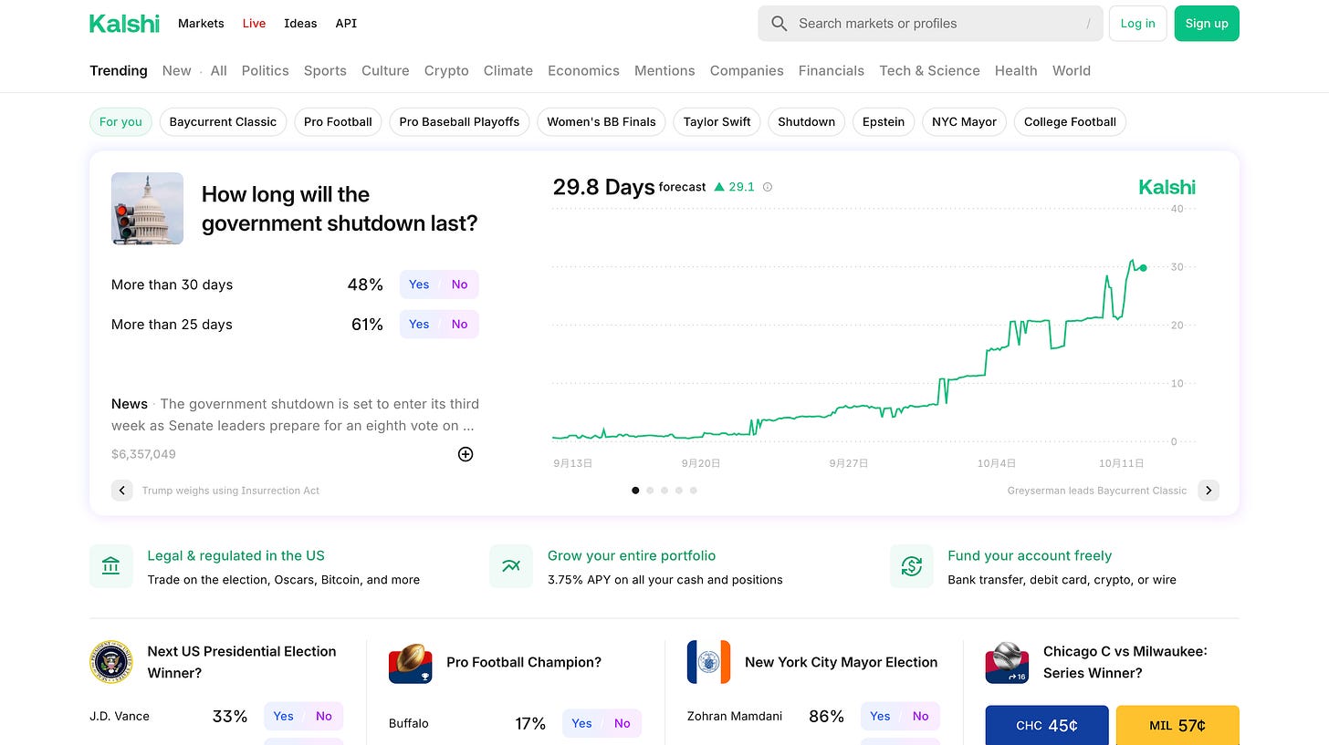 概要:CFTC(米商品先物取引委員会)の規制下にある予測市場取引所。ユーザーは、政治やスポーツから経済指標や天気まで、現実世界の出来事に関する「イベント契約」を取引。
