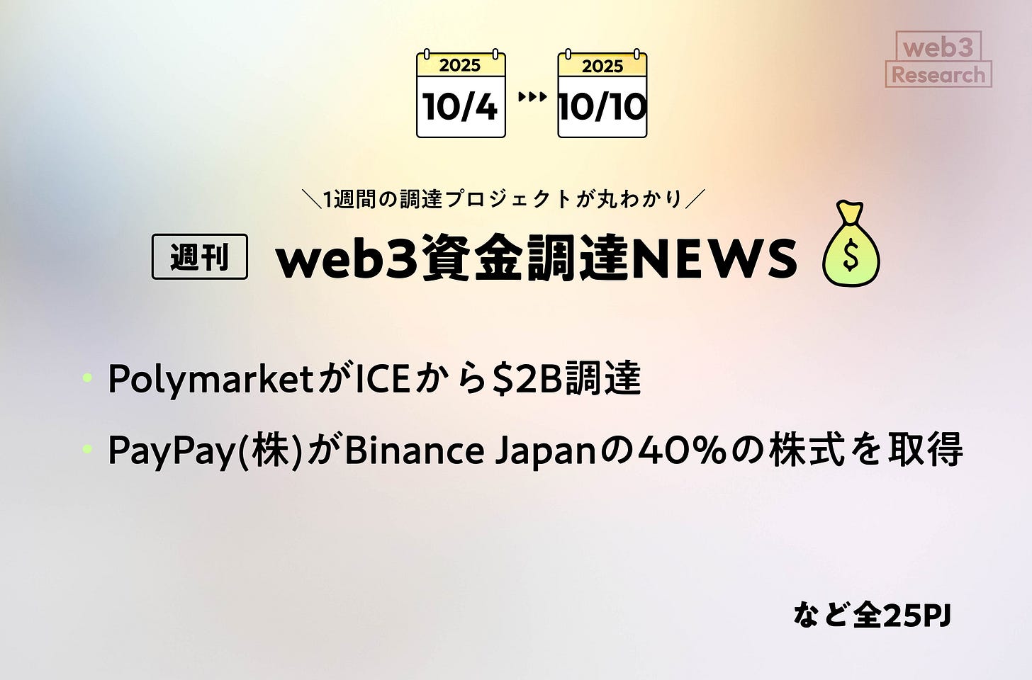 PolymarketがICEから$2B調達、PayPay(株)がBinance Japanの40%の株式を取得など、全25PJ【資金調達PJまとめ】