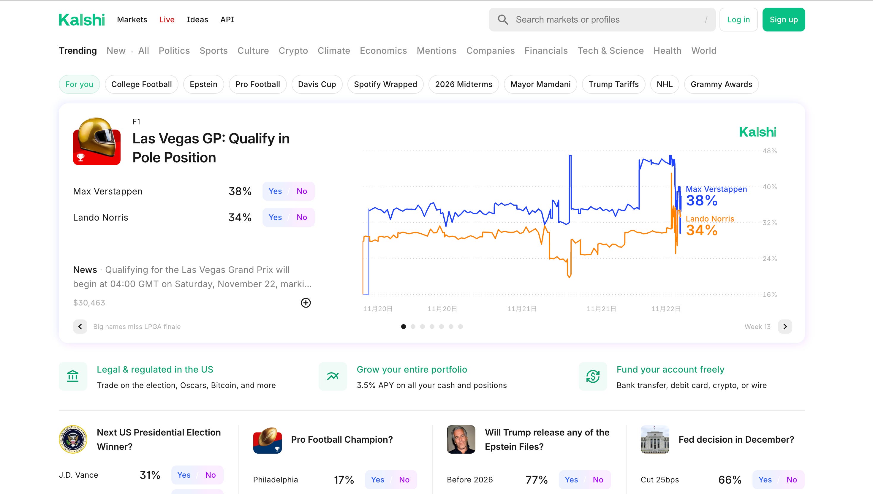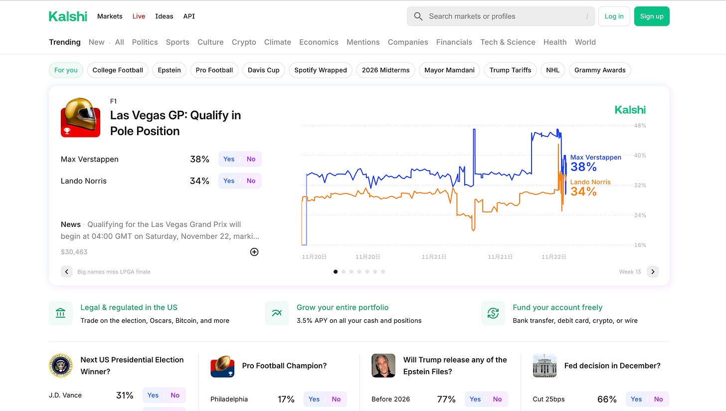 概要:CFTC(米商品先物取引委員会)規制下の予測市場取引所。ユーザーは、政治やスポーツから経済指標や天気まで、現実世界の出来事に関する「イベント契約」を取引。参加者は、イベント発生時に1ドルで決済されるバイナリー契約を売買できる。
