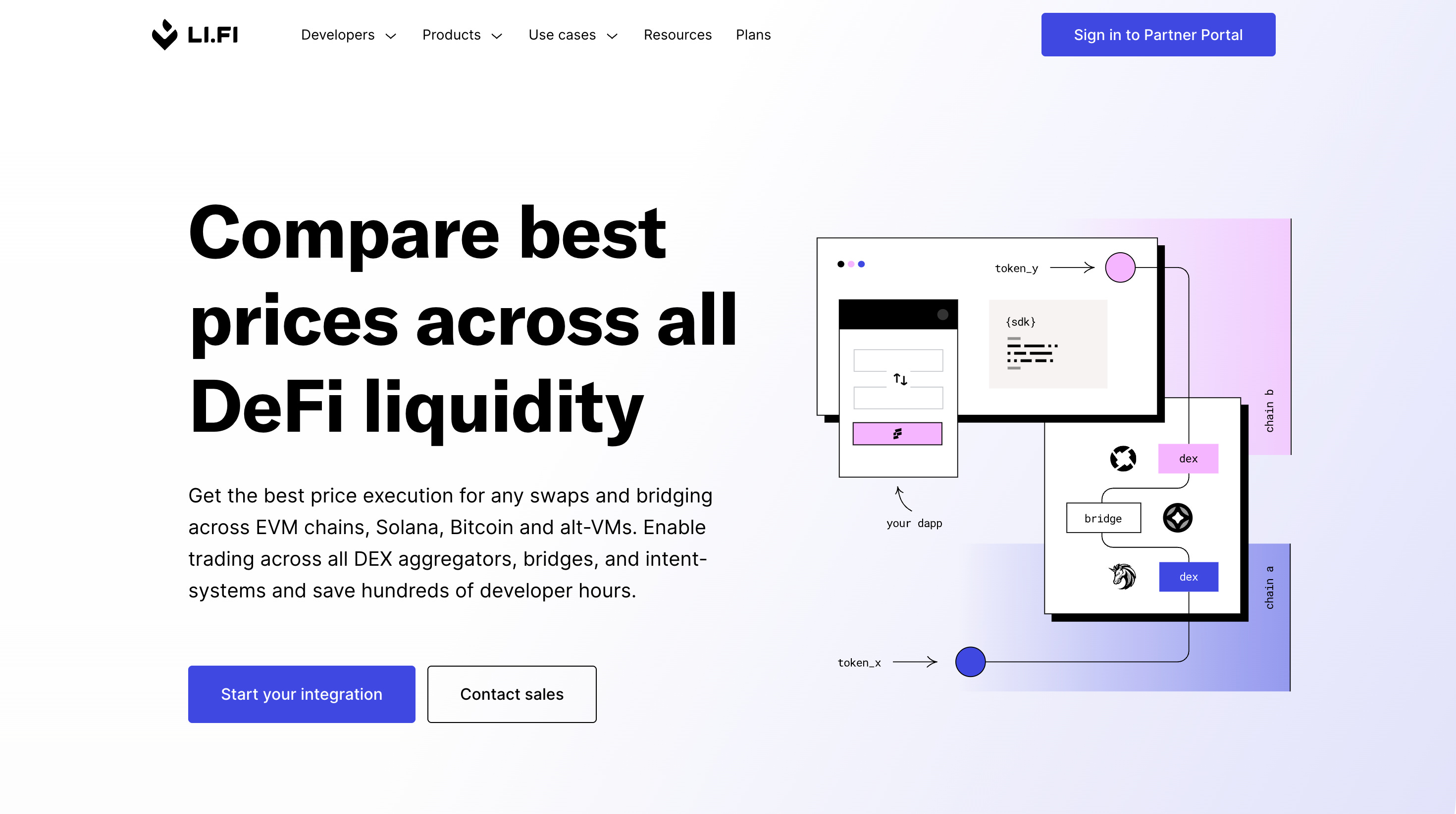 概要:単一のAPI、SDK、またはウィジェットを通じて、開発者とユーザーをブリッジ、DEX、そして分散型流動性ソースに接続する、クロスチェーン流動性アグリゲーションプロトコル。取引とブリッジをスマートにルーティングし、最適な価格、最低コスト、そして最も安全なパスを見つけることで、30以上のブロックチェーン間で最適化されたあらゆるスワップと資産移転を実現。