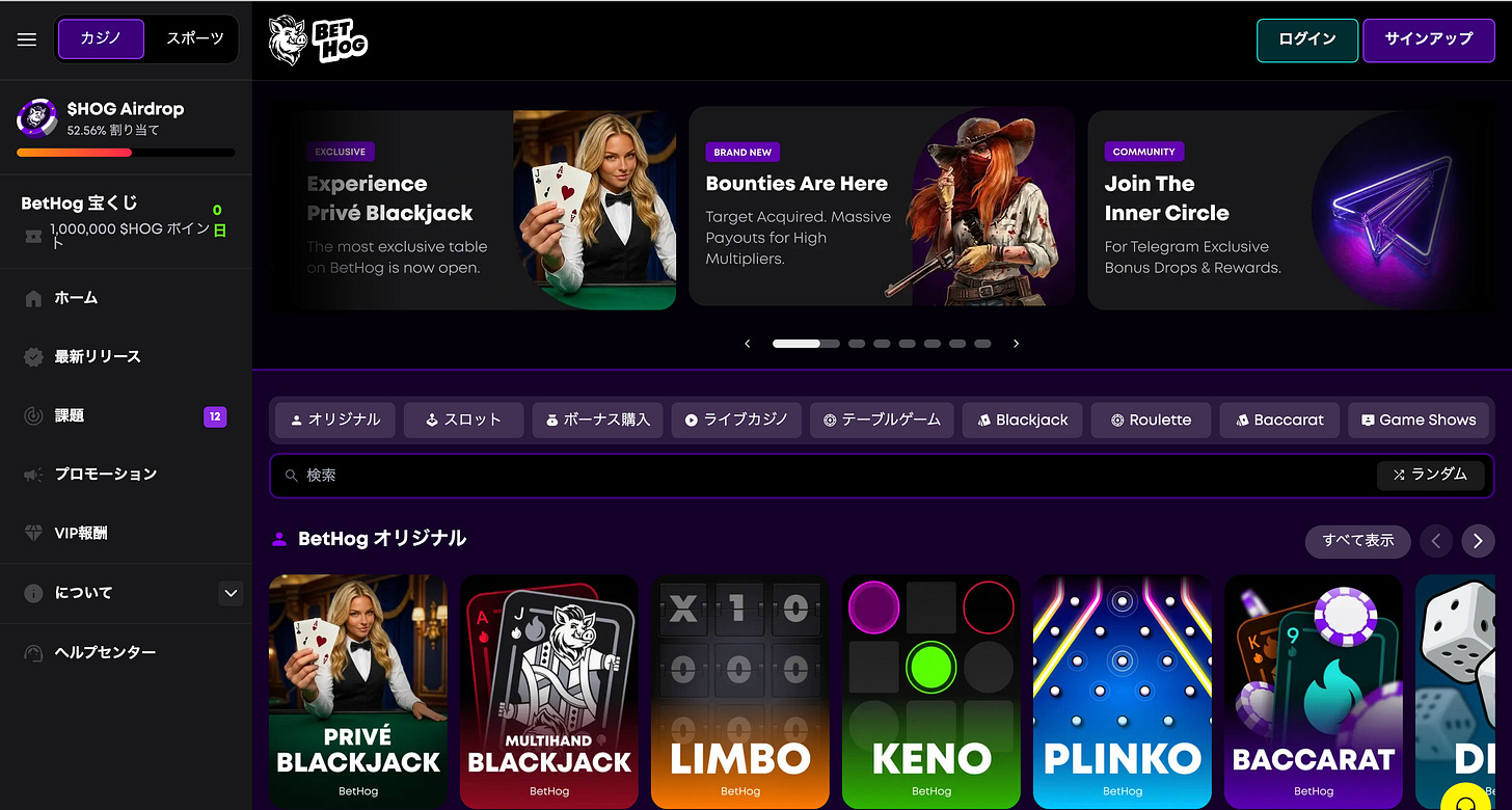 概要:大手オンラインスポーツベッティングおよびデイリーファンタジースポーツプラットフォーム。Solana上に構築され、クラッシュゲームやマイニングゲームに革新的なアプローチを取り入れた独自の「BetHog Originals」を含むPvPカジノゲームをサポート。