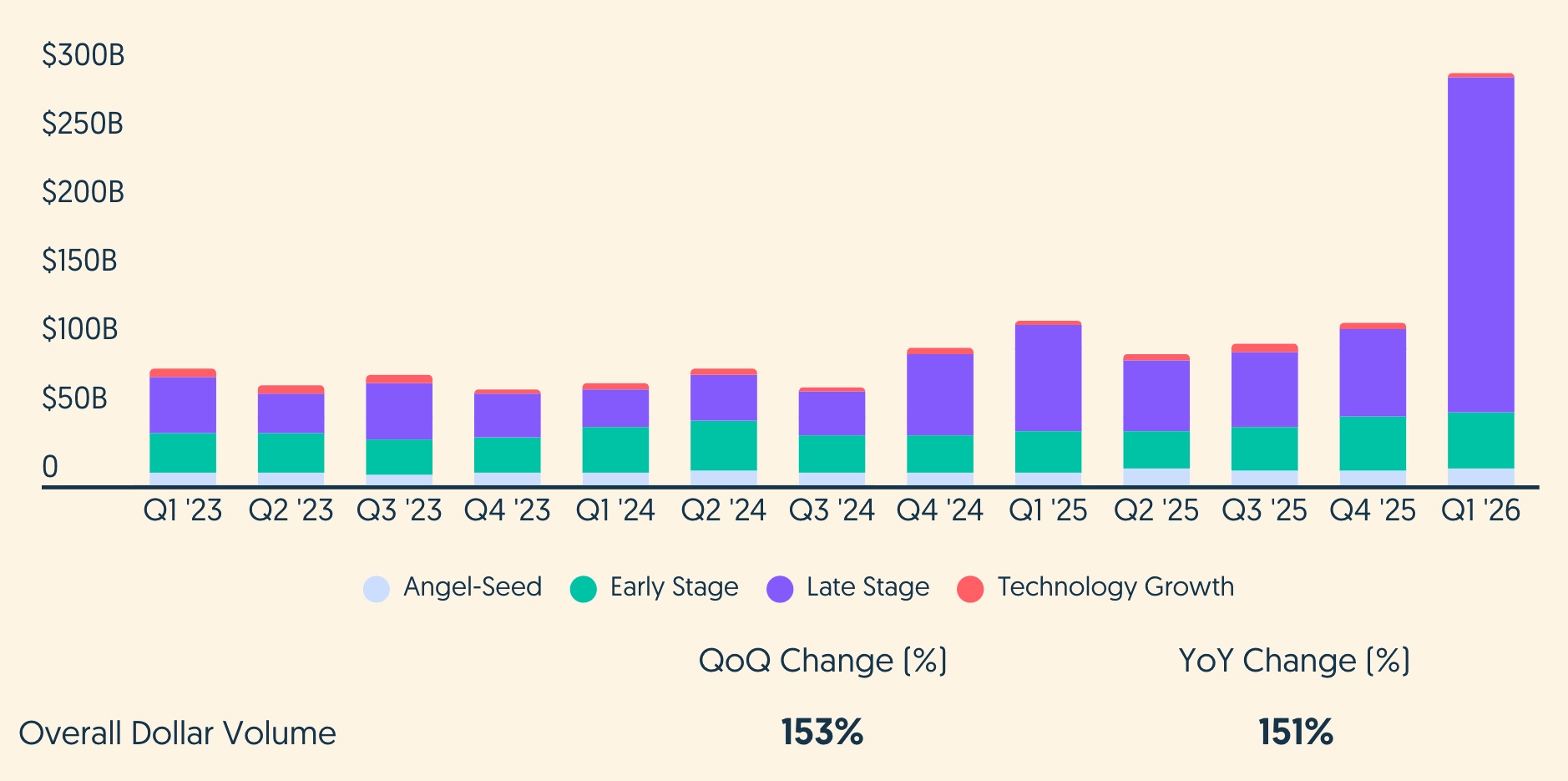 2026年Q1のグローバルベンチャー資金調達は約6,000社に対して約3,000億ドルに達し、四半期・前年比ともに約150%増という史上最高を記録した。