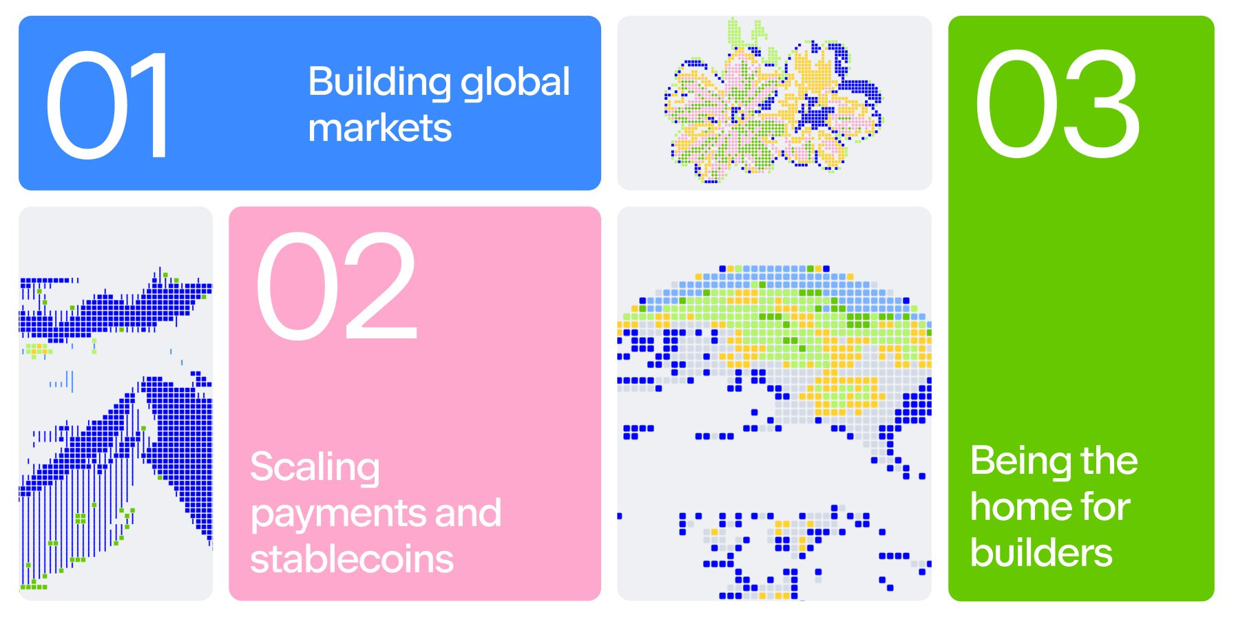 2026年の重点戦略は「グローバル市場の構築」「決済とステーブルコインのスケール」「ビルダーの拠点化」の3本柱で、株式・コモディティ・予測市場・パーペチュアルなどあらゆる資産クラスをBaseへ取り込むことを目指す。
